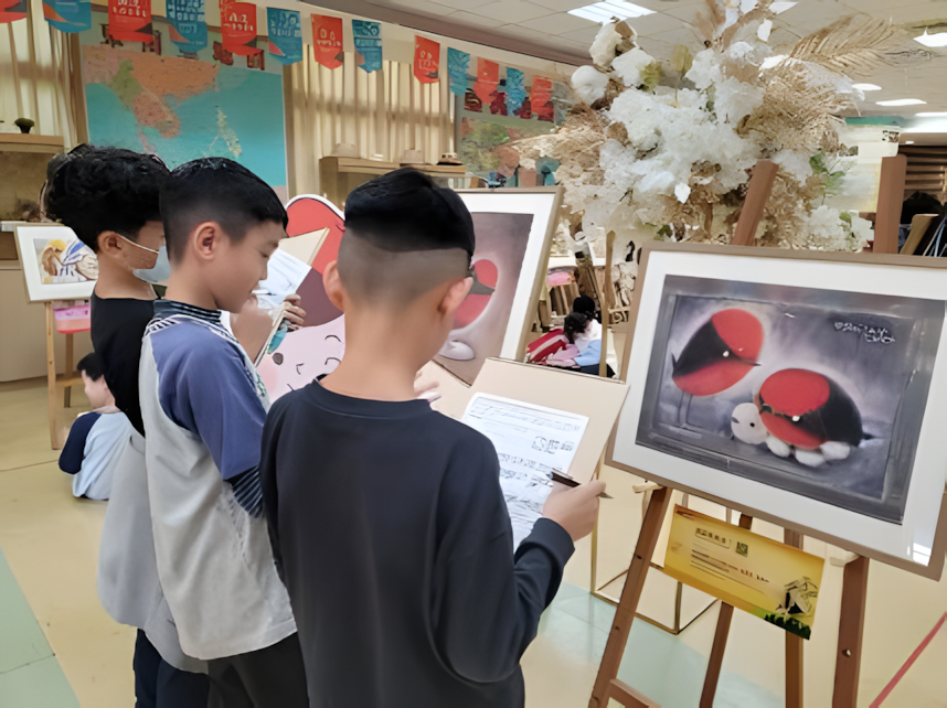 新北市樹林國小113學年展覽現場:將畫作擺在學生視線可以輕易觀賞的高度是很重要的。