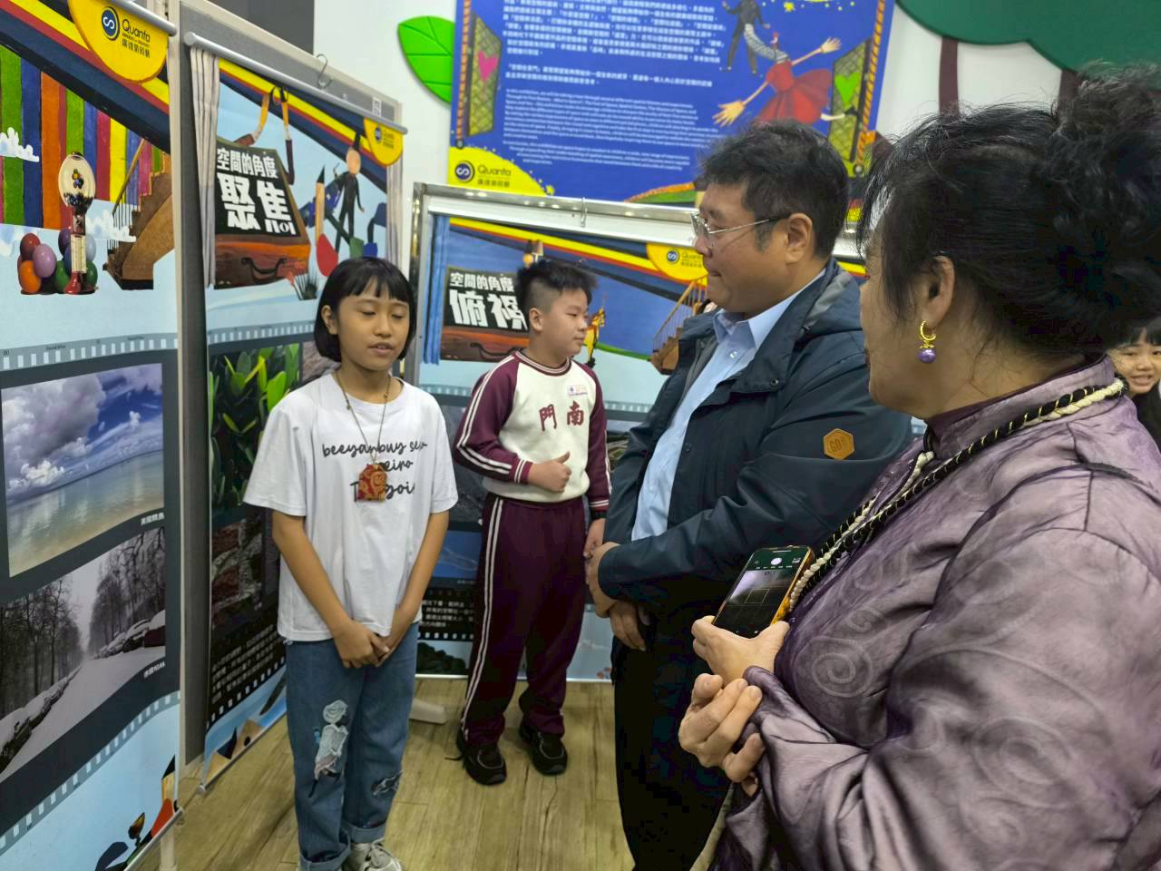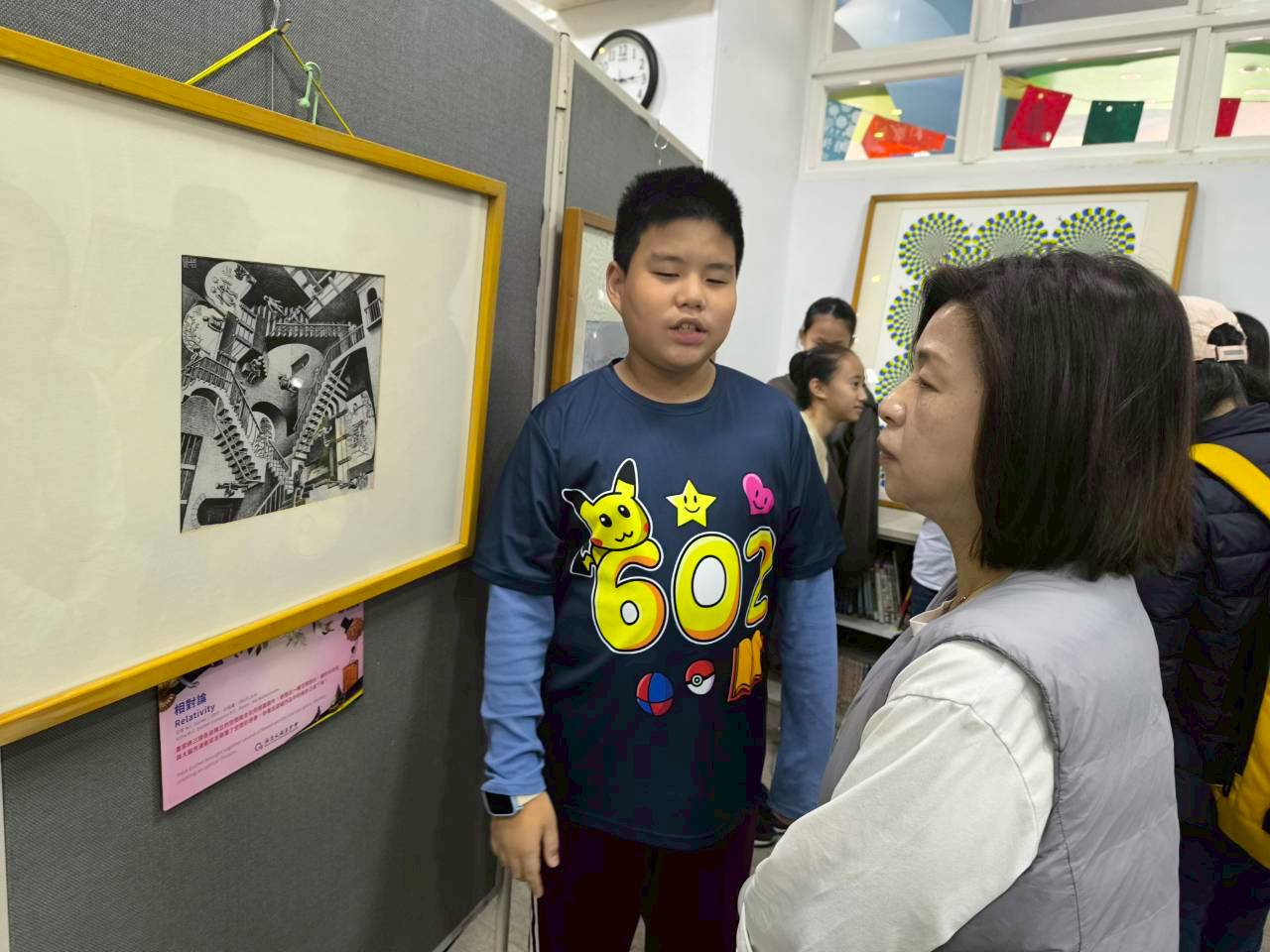 小尖兵的蛻變:比知識更珍貴的是自信,開幕典禮上,最令人動容的風景,莫過於那群落落大方的「導覽小尖兵」。看著照片中的男同學,眼神專注地向貴賓解說艾雪的《相對論》;或是直笛隊孩子們在台上沈穩優雅的吹奏。他們口條清晰、儀態自信,這份從容並非一蹴可幾,而是經過長時間培訓與練習的成果。